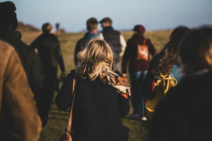Marche consciente en binômes, pique‑nique, chant du monde, mandala naturel. Simplicité, grand air, bien‑être.